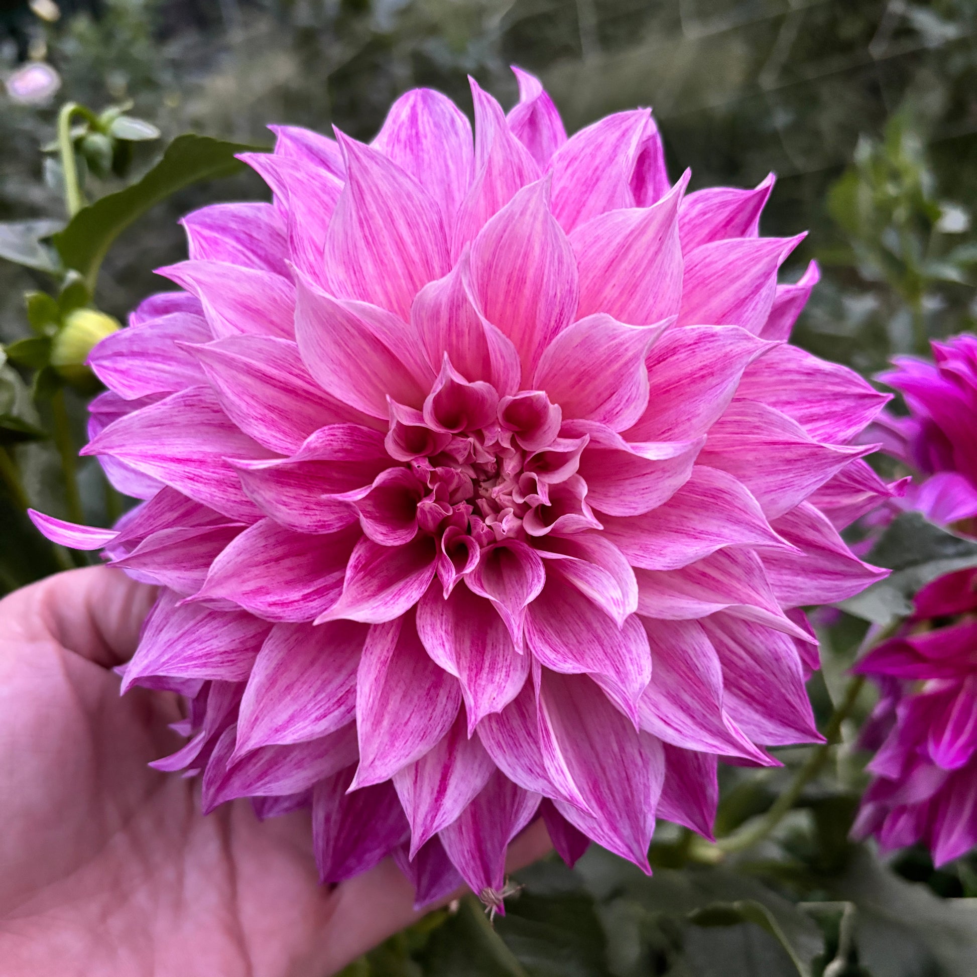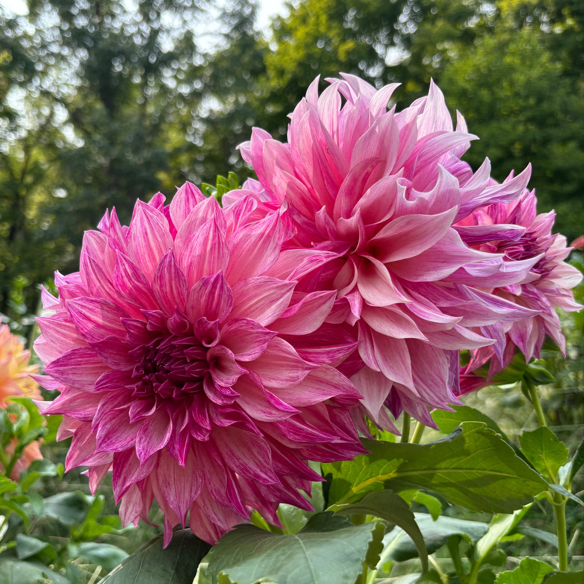 Dahlia - Café au Lait Royal features a stunning blend of bright pink, purple, and creamy white in its large dinnerplate blooms, similar to its famous cousin. Variations may occur among flowers, adding to the uniqueness of each bloom.